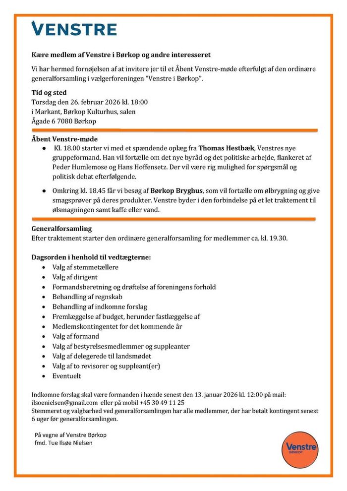 Tid og sted: Torsdag den 26. februar 2026 kl. 18:00 , i Markant, Børkop Kulturhus