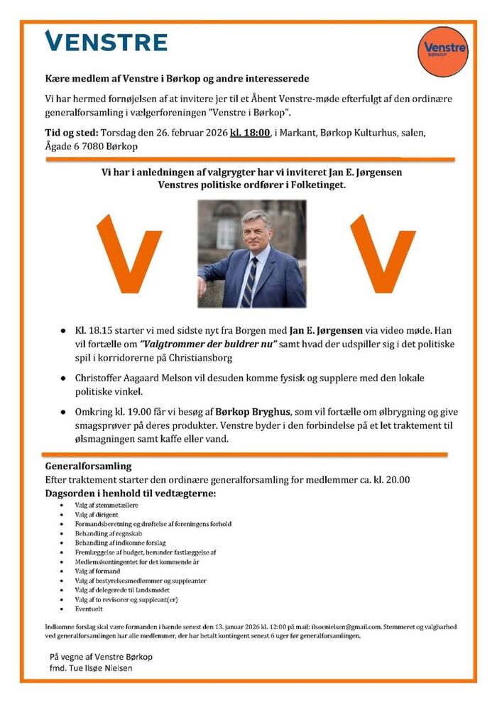 Vi har nogle rigtig spændende nyheder til jer! Med udsigt til et muligt kommende valg har vi fået en mulighed for at lave en ændring i programmet til Generalforsamlingen. Derfor er vi enormt glade for at kunne byde velkommen til Jan E. Jørgensen og Christoffer Aagaard Melson, som vil deltage i vores arrangement.